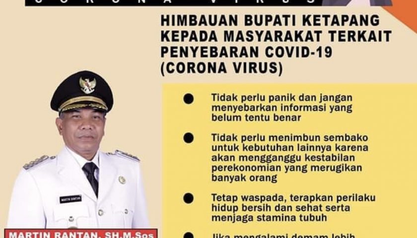KETAPANG, MENINTNEWS.id – Menyikapi persoalan virus Corona yang saat ini mewabah disejumlah Negara. Bupati Ketapang, Martin Rantan, meminta kepada masyarakat agar tidak panik. Terlebih lagi sampai melakukan hal-hal yang dapat merugikan diri sendiri dan orang lain. Pasalnya, hingga saat ini belum ditemukan kasus Corona di wilayah Ketapang khususnya.