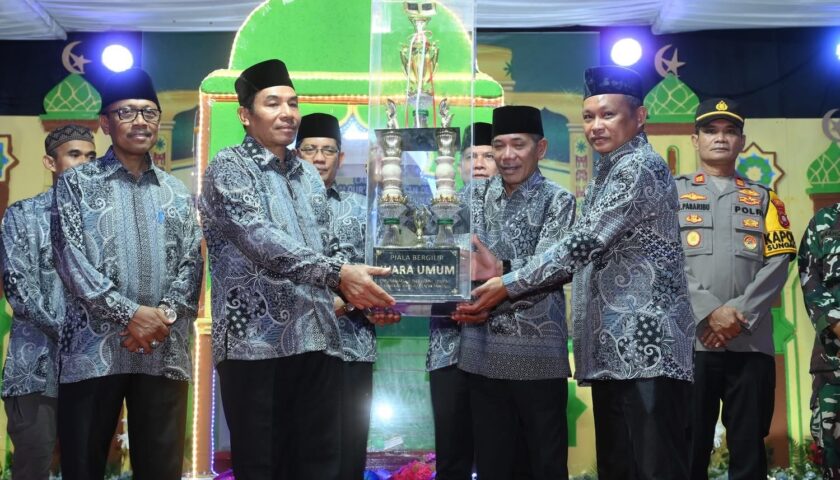 PIALA BERGILIR : Wabup Ketapang, Jamhuri Amir, menyerahkan piala bergilir kepada panitia untuk diperebutkan kembali pada MTQ XXXII Ketapang di Sungai Laur, Selasa (15/7).