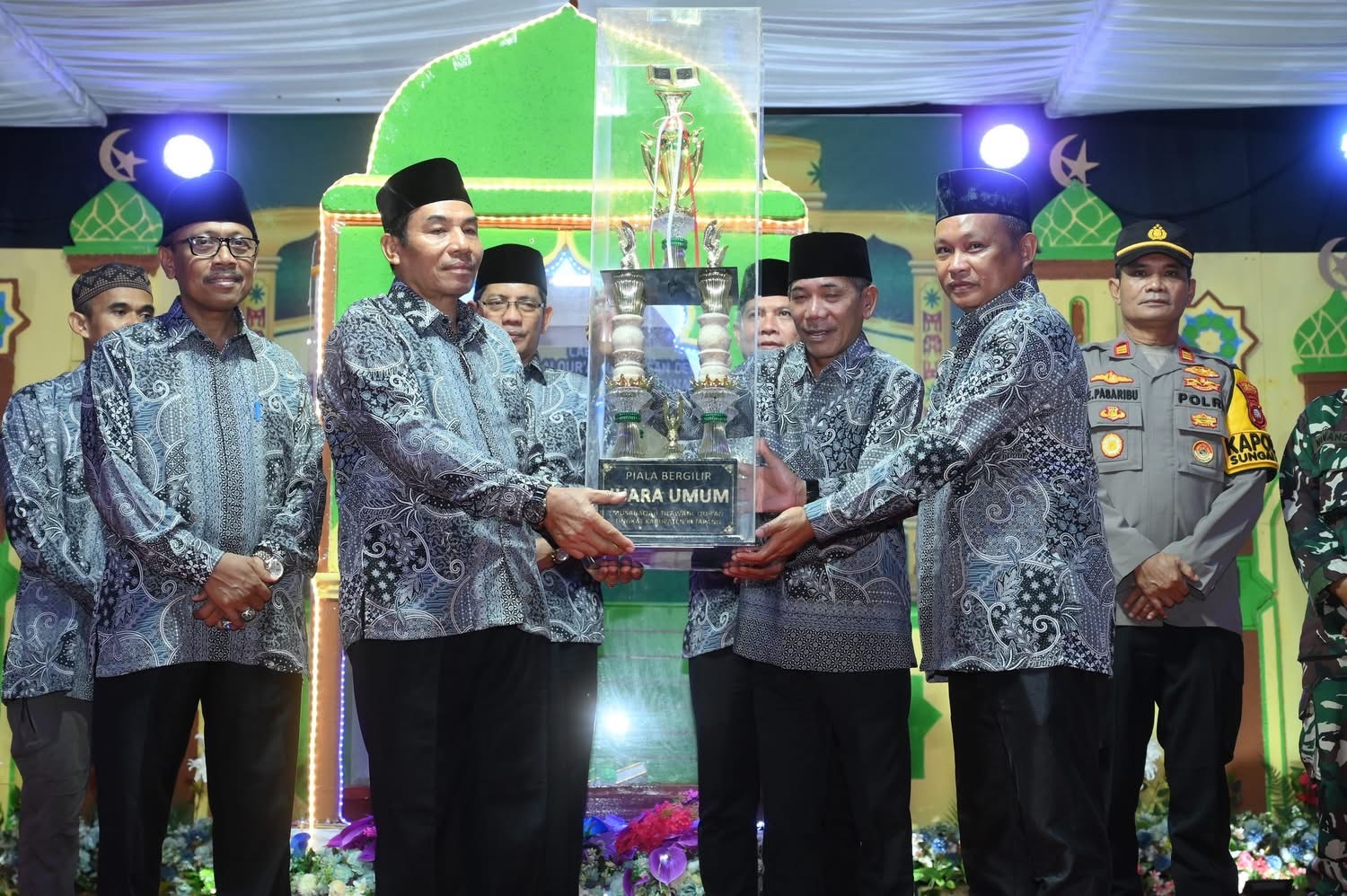PIALA BERGILIR : Wabup Ketapang, Jamhuri Amir, menyerahkan piala bergilir kepada panitia untuk diperebutkan kembali pada MTQ XXXII Ketapang di Sungai Laur, Selasa (15/7).