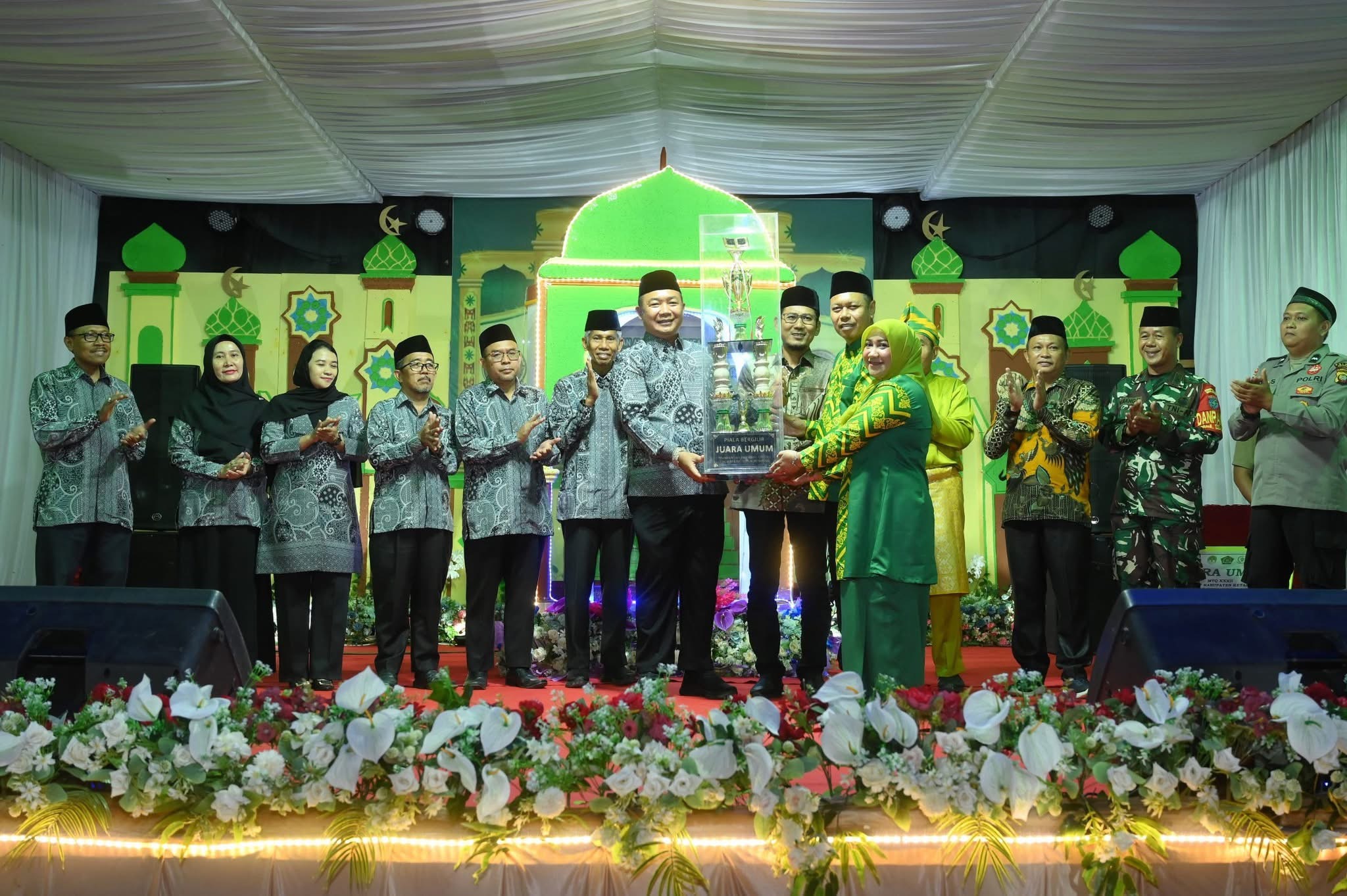 JUARA UMUM : Bupati Ketapang, Alexander Wilyo, menyerahkan piala juara umum kepada kafilah Delta Pawan, Jumat (18/7) malam.