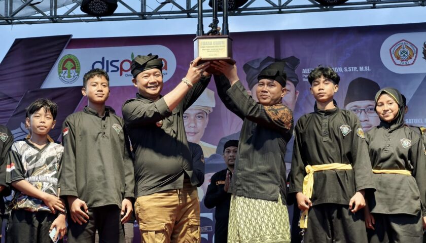 SERAHKAN PIALA : Bupati Ketapang, Alexander Wilyo, menyerahkan piala kepada juara umum pada Festival Pencak Silat Tradisional 2025, Kamis (14/8).