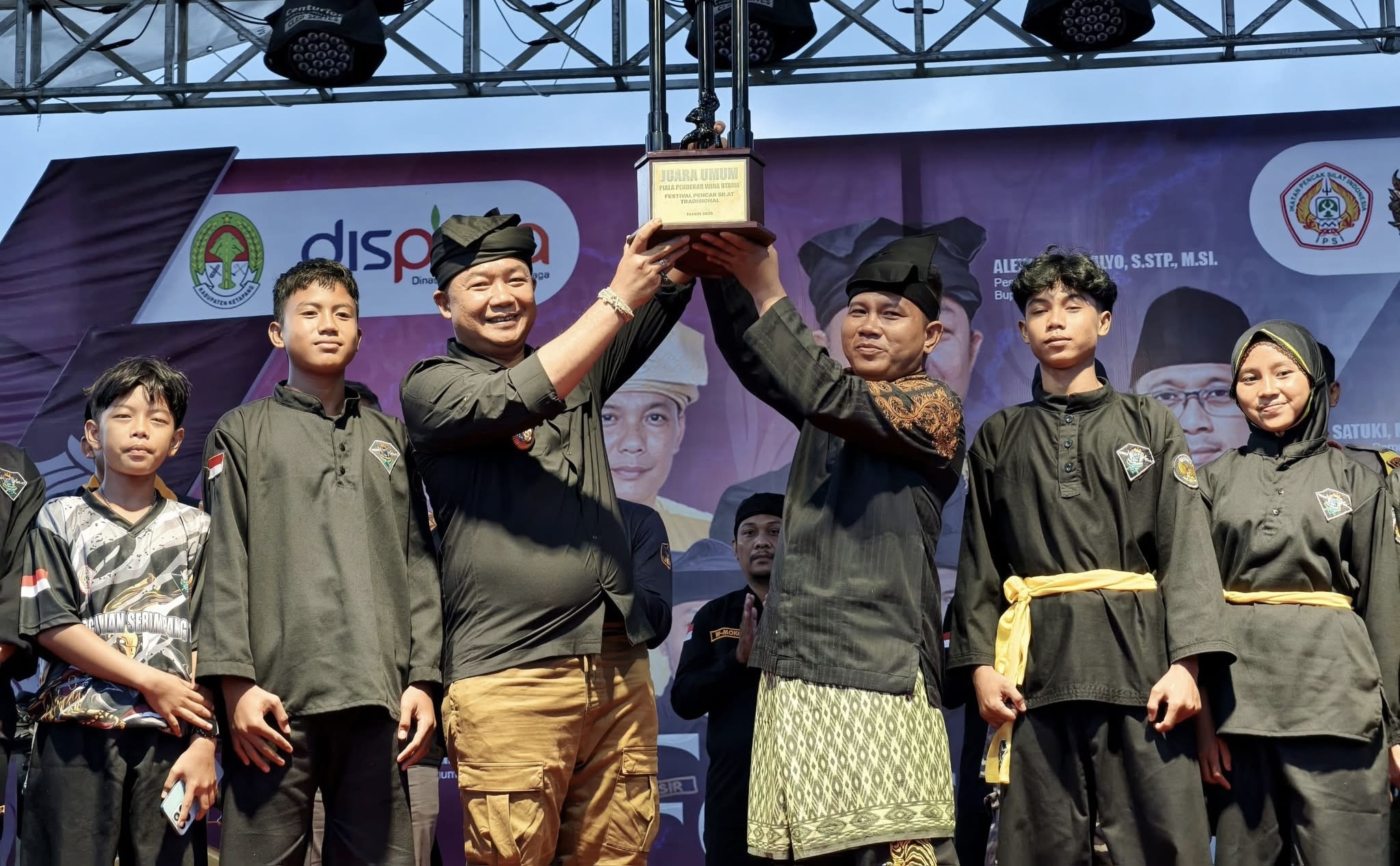 SERAHKAN PIALA : Bupati Ketapang, Alexander Wilyo, menyerahkan piala kepada juara umum pada Festival Pencak Silat Tradisional 2025, Kamis (14/8).