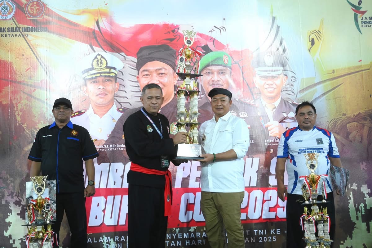SERAHKAN PIALA : Bupati Ketapang, Alexander Wilyo, menyerahkan piala kepada Perguruan Wekasan yang berhasil menjadi juara umum.