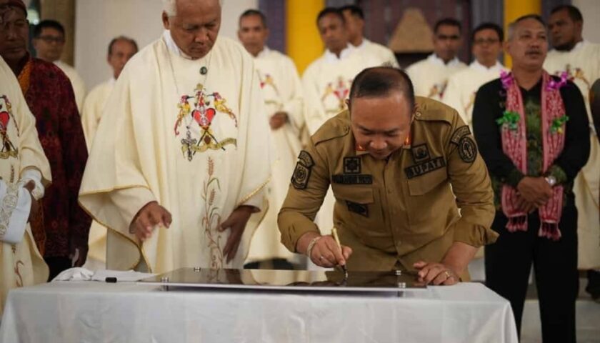 KETAPANG, MENITNEWS.id – Bupati Ketapang, Alexander Wilyo, meresmikan Gereja Katolik Stasi Maria Ratu Rosario di Desa Bandasari, Kecamatan Air Upas, Kamis (20/11). Sementara pemberkatan dipimpin langsung oleh Uskup Keuskupan Ketapang, Mgr. Pius Riana Prapdi.