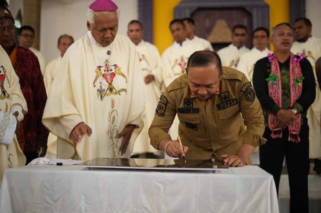 RESMIKAN : Bupati Ketapang, Alexander Wilyo, menandatangani prasasti Gereja Katolik Stasi Maria Ratu Rosario di Desa Bandasari, Kecamatan Air Upas, Kamis (20/11).
