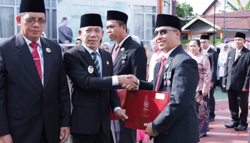KETAPANG, MENITNEWS.id – Wakil Bupati Ketapang, Jamhuri Amir, memimpin upacara Hari Amal Bakti (HAB) Kemenag ke-80, di halaman Kemenag Ketapang, Sabtu (3/1). Pada kesempatan itu, Jamhuri membacakan sambutan tertulis Menteri Agama RI, Nasaruddin Umar.