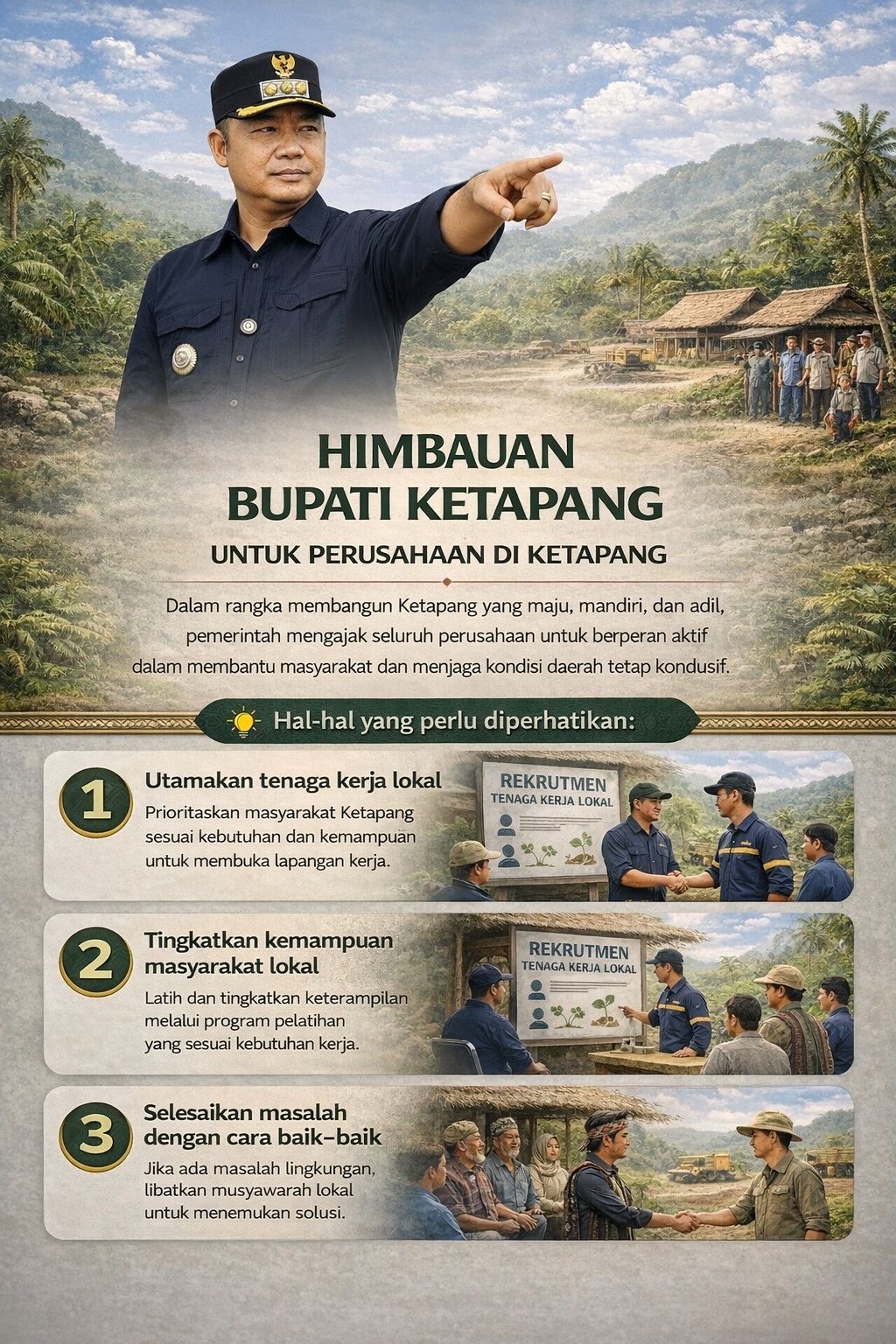 Pertama, perusahaan diminta memprioritaskan rekrutmen tenaga kerja lokal sesuai dengan kebutuhan dan kualifikasi yang dibutuhkan. Kebijakan ini bertujuan untuk memperluas kesempatan kerja, menekan angka pengangguran, serta mendorong pertumbuhan ekonomi daerah.